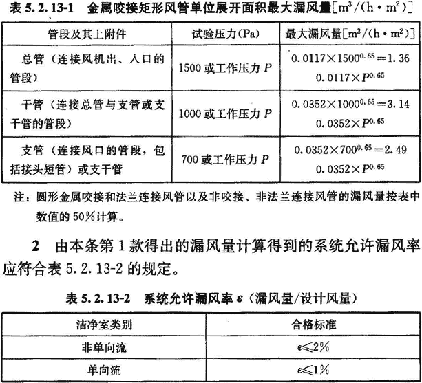5.2.13 咬接和法蘭連接的金屬風(fēng)管,應(yīng)在膠封縫隙以后和絕熱之前,按附錄A的方法進(jìn)行分段漏風(fēng)檢測或按現(xiàn)行國家標(biāo)準(zhǔn)《通風(fēng)與空調(diào)工程施工質(zhì)量驗(yàn)收規(guī)范》GB 50243的方法進(jìn)行干管和主管系統(tǒng)的漏風(fēng)檢測。1~5級(jí)潔凈度環(huán)境的風(fēng)管應(yīng)全部進(jìn)行漏風(fēng)檢測,6~9級(jí)潔凈度環(huán)境的風(fēng)管應(yīng)對30%的風(fēng)管并不少于1個(gè)系統(tǒng)進(jìn)行漏風(fēng)檢測。檢測結(jié)果應(yīng)同時(shí)符合下列兩項(xiàng)嚴(yán)密性指標(biāo):