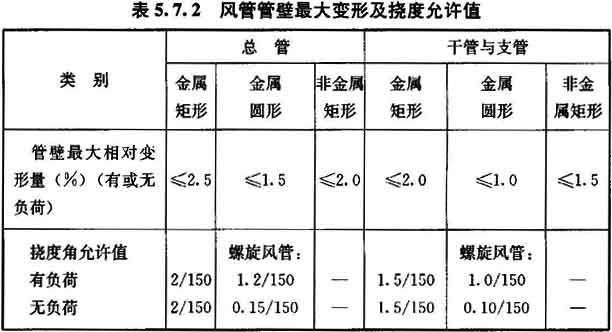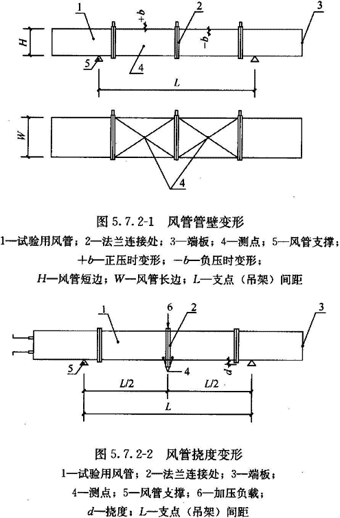 10 外購成品風(fēng)管應(yīng)有變形試驗(yàn)。風(fēng)管管壁最大變形相對量(表面最大不平度b與風(fēng)管短邊長度H之比,圖5.7.2—1)及撓度角允許值[兩段風(fēng)管組合件中央連接法蘭部位的撓度量d與該兩風(fēng)管組合的兩吊架(支點(diǎn))間距一半L/2之比,見圖5.7.2—2]應(yīng)符合表5.7.2的規(guī)定。