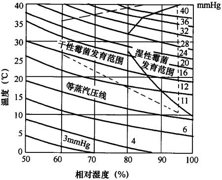 6.2.7、6.2.8 本節(jié)對(duì)圍護(hù)結(jié)構(gòu)內(nèi)表面抗菌涂飾工程進(jìn)行了規(guī)定,由于在食品工業(yè)用房?jī)?nèi)使用抗菌涂飾工程目前在國(guó)內(nèi)外意見不太統(tǒng)一,擔(dān)心抗菌產(chǎn)品會(huì)使食品中產(chǎn)生抗藥性菌株,但對(duì)于濕度經(jīng)常超過75%或有蒸汽作業(yè)的房間或關(guān)鍵區(qū)域的抗菌防霉問題,目前仍沒有更好的解決辦法,內(nèi)表面抗菌有很多方法,如消毒,但本規(guī)范僅對(duì)使用抗菌涂料的情況進(jìn)行了規(guī)定。當(dāng)相對(duì)濕度達(dá)到80%時(shí),不論溫度高低,基本上都要發(fā)霉,見圖4,所以此時(shí)可涂防霉涂料。