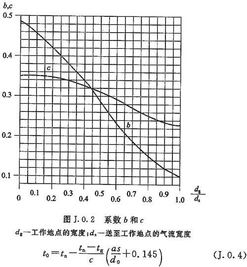 J.0.4 送風(fēng)口的出口溫度應(yīng)按下式計(jì)算。當(dāng)送冷風(fēng)時(shí),計(jì)算的送風(fēng)口出口溫度較低時(shí),可選用較大尺寸的送風(fēng)口重新確定相關(guān)參數(shù)。